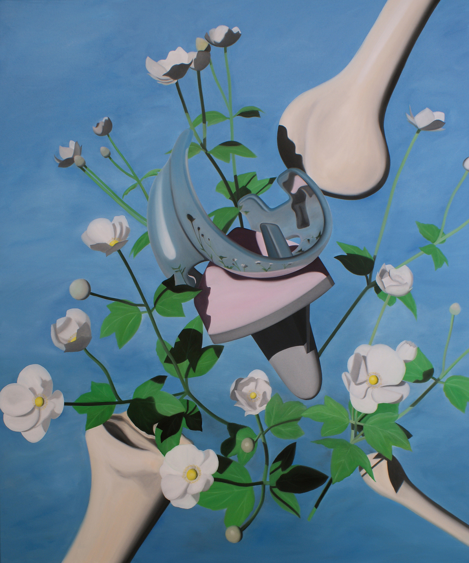 Dans une époque de changements conséquents, je souhaite réinterpréter les codes classiques de la vanité au travers de compositions picturales mêlant fleurs symboliques, ossements, symboles anciens de résurrection et prothèses médicales.