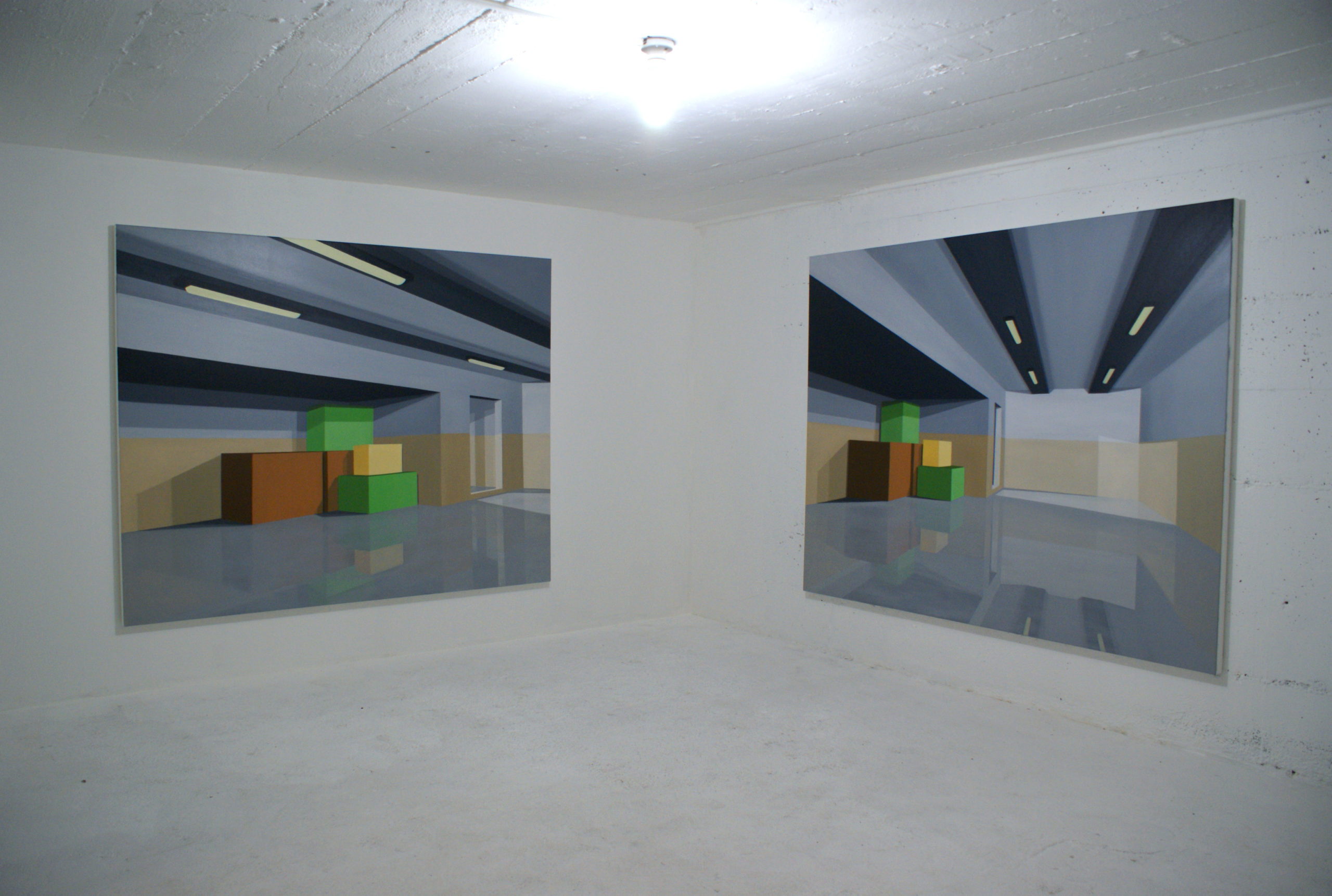 Fasciné par l’observation du climat de crainte dans lequel nous évoluons et par les réflexes sécuritaires qui en découlent, j’ai commencé en 2004 une série de peintures mêlant technique classique (huile sur toile) et imagerie de synthèse, représentant des lieux de l’ordre du dernier paysage en cas de catastrophe.